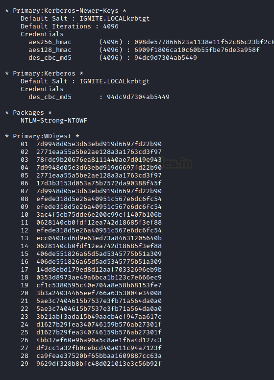 Tương tự như cuộc tấn công DC Sync mà chúng tôi vừa thực hiện trên một người dùng cụ thể, vì vậy hàm băm NTLM trả về cũng là của người dùng cụ thể đó. Nhưng trong trường hợp kẻ tấn công muốn trích xuất toàn bộ hàm băm của tất cả người dùng được tạo trên Domain Controller. Đây là khi mô-đun băm bắt đầu hoạt động. Nó sẽ thực hiện cuộc tấn công DC Sync cho mỗi người dùng và sau đó cung cấp hàm băm cho tất cả họ trong một chế độ xem tổng hợp như thể hiện trong hình ảnh bên dưới.