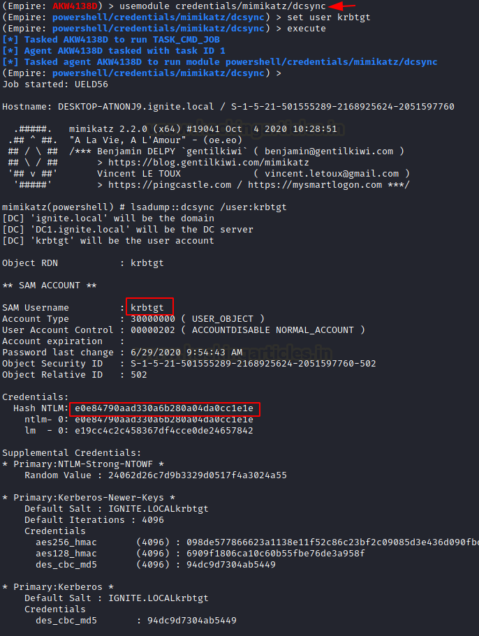 Việc tải mô-đun dcsync sẽ gọi tập lệnh mimikatz PowerShell để thực hiện cuộc tấn công dcsync để lấy thông tin xác thực bằng cách yêu cầu từ một bộ điều khiển miền khác trong miền. Ở đây, chúng tôi đang yêu cầu HASH tài khoản KRBTGT và sẽ truy xuất KRBTGT NTLM HASH.