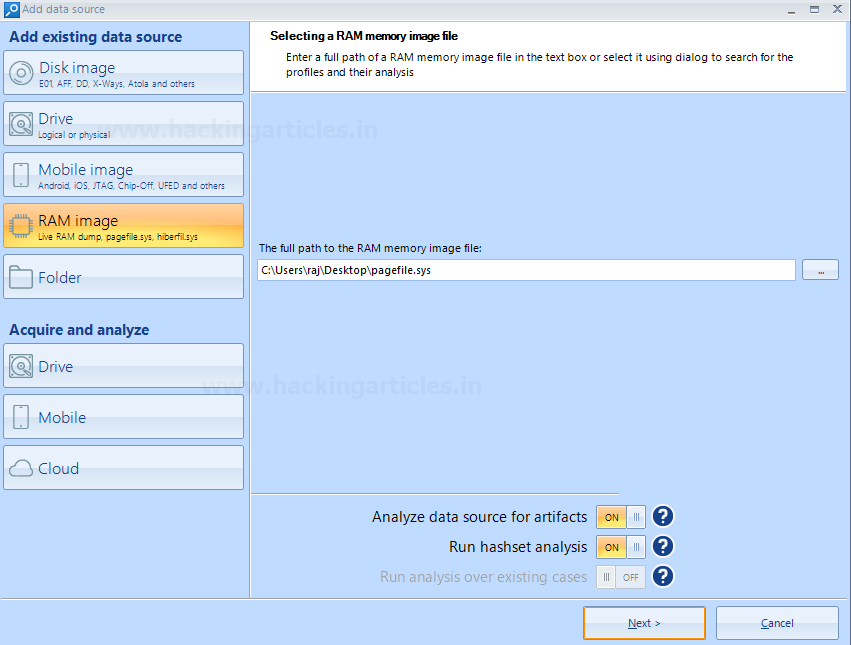 Để phân tích bộ nhớ đã chiếm (tệp trang), hãy chọn tùy chọn Hình ảnh RAM; thêm tệp pagefile.sys mà bạn đã tạo trước đó làm nguồn bằng chứng bằng cách sử dụng trình hình ảnh FTK.