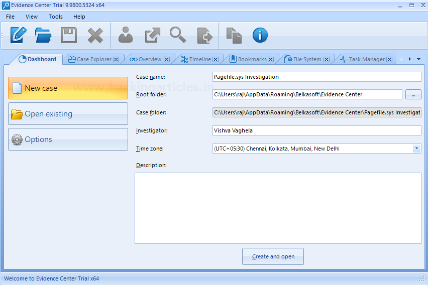 Trước hết, hãy tạo một trường hợp mới. Điền thông tin trường hợp, chọn thư mục gốc, nếu muốn, bạn có thể thêm trường hợp mô tả. Nhấp vào tạo và mở để tiếp tục phân tích thêm.