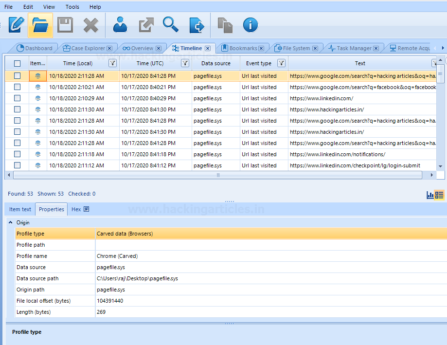 Tab dòng thời gian hiển thị chế độ xem tổng thể của dữ liệu được khắc để dễ dàng phân tích cùng với thời gian và URL của trang web tìm kiếm đã truy cập.