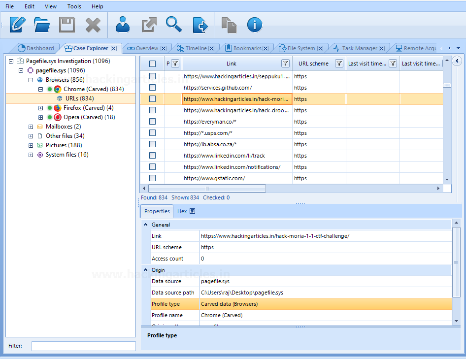 Hãy mở rộng và phân tích hồ sơ Trình duyệt. Nó đã khắc lịch sử chrome bao gồm các URL, hãy kiểm tra phần được khắc chrome để biết thêm chi tiết. Nó bao gồm các URL cho các trang web đã truy cập, một trong số đó được đánh dấu trong ảnh chụp màn hình sau.