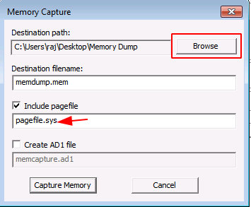 Bước tiếp theo là duyệt đường dẫn đích theo ý muốn, chọn giải pháp thay thế “bao gồm tệp trang” và nhấp vào Capture Memory.