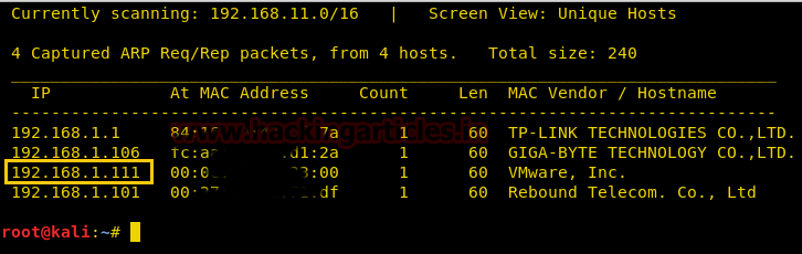 Bật máy tấn công của bạn và sử dụng lệnh netdiscover để quét mạng cục bộ của bạn để lấy IP mục tiêu.