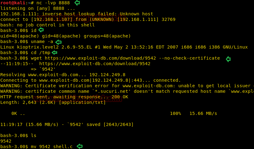 Sau đó, với sự trợ giúp của Google, chúng tôi tìm kiếm khai thác Kernel của nó để nâng cấp đặc quyền và tìm thấy May mắn thay “Linux kernel 2.6 <2.6.19 (32bit) ip_append_data () local ring0 root khai thác” do đó chúng tôi có thể sử dụng 9542exploi t để leo thang đặc quyền.