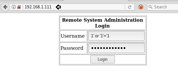 | 1 2 | Username: 1′ or ‘1’ Password: 1′ or ‘1’ |