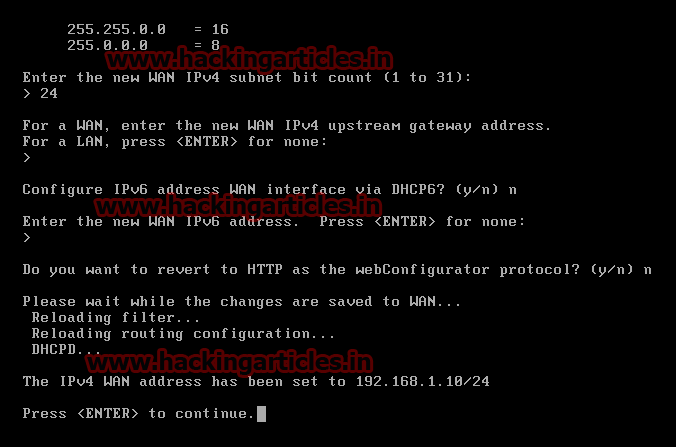 Bạn có thể thấy rằng IP mong muốn của bạn cho WAN đã được thiết lập. Nhấn enter để tiếp tục.
