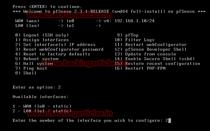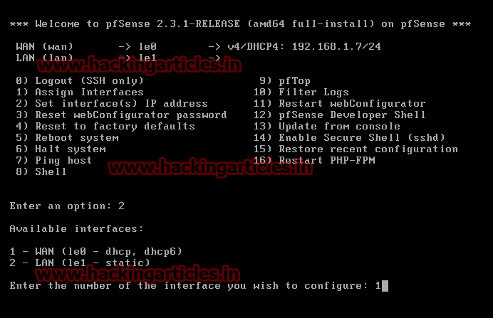 Bây giờ, trong hình ảnh sau, bạn có thể thấy rằng nó đã tự động lấy địa chỉ IP cho WAN tức là 192.168.1.7, nếu bạn muốn đặt IP mong muốn cho WAN thì hãy chọn tùy chọn 2 và nhấn phím 1 để cấu hình mạng WAN.