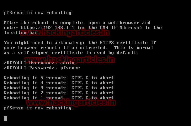 Sau cấu hình ban đầu, quá trình khởi động sẽ tiếp tục cho tới khi bạn vào được giao diện điều khiển của pfSense, giao diện này là một menu đơn giản cho phép bạn cấu hình các thiết lập giao diện, kích hoạt cấu hình Web và các dịch vụ khác, thiết lập lại cấu hình mặc định của nhà máy, cài đặt pfSense vào ổ đĩa cứng. pfSense sẽ tự động gán địa chỉ IP cho giao diện LAN, nhưng chúng tôi đã sử dụng một địa chỉ riêng chính vì vậy đã thay đổi địa chỉ IP của LAN để địa chỉ mới sẽ được sử dụng trong suốt quá trình cài đặt trên đĩa cứng. Bạn phải format và tạo partition đĩa trước khi cài đặt pfSense. Nếu bạn chọn partition được khuyến khích thì pfSense sẽ tạo nó cho bạn. Mặc dù vậy bạn vẫn có tùy chọn để tạo một partition layout của riêng mình