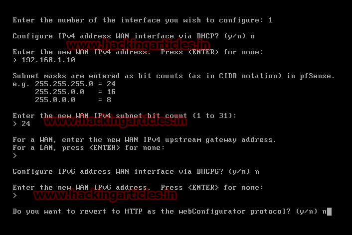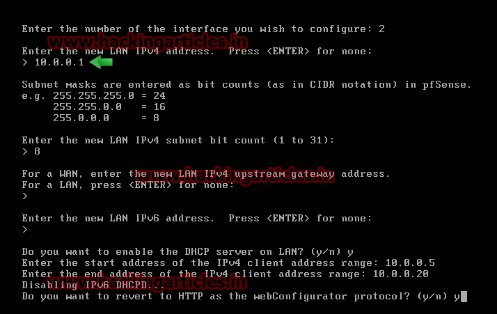 Giống như trước đây, nó sẽ hỏi bạn địa chỉ IP của mạng LAN và do đó bạn nhập địa chỉ IP mạng LAN của mình. Và sau đó nó sẽ yêu cầu bạn cung cấp mặt nạ mạng con, ở đây chúng tôi đã đưa ra mặt nạ mạng con là 8 vì IP của chúng tôi thuộc loại A. Chỉ cần nhấn enter khi nó yêu cầu bạn nhập cổng ngược dòng. Và cũng nhấn enter khi nó yêu cầu bạn nhập IPv6 vì chúng tôi không yêu cầu. Và sau đó nhấn y cho tùy chọn hoàn nguyên HTTP .