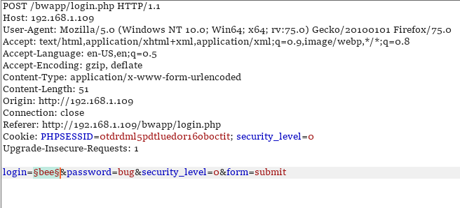 Phun mật khẩu cũng có thể được áp dụng trên Ứng dụng web. Để hiển thị điều này, tôi quyết định sử dụng BWAPP. Nó cho phép tạo người dùng khi ta cần nhiều người dùng cho mục đích thực tế này. Bây giờ, sau khi tạo người dùng, hãy chuyển đến trang đăng nhập của BWAPP và nhập thông tin đăng nhập và nắm bắt yêu cầu trên BurpSuite. Sau đó nhấp chuột phải vào yêu cầu đã chụp và gửi đến Intruder.