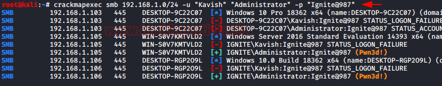 crackmapexec smb 192.168.1.0/24 -u "Kavish" "Quản trị viên" -p " Ignite @ 987 "