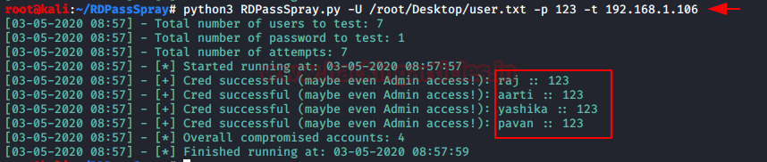 python3 RDPassSpray.py -U /root/Desktop/user.txt -p 123 -t 192.168.1.106