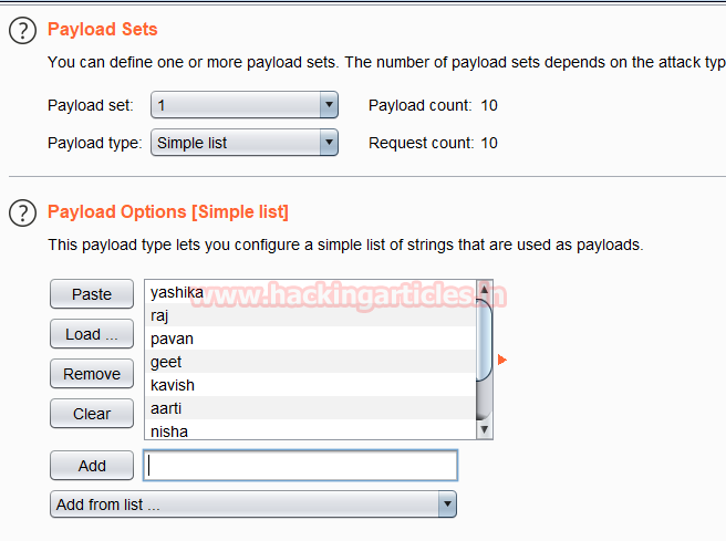 Bây giờ vào tab Tải trọng (Payload) . Ở đây, chúng tôi sẽ cung cấp các tùy chọn tải trọng hoặc tên người dùng mà chúng tôi đang đưa vào từ điển trong các cuộc tấn công trước. Chúng ta có thể dán trực tiếp nó từ từ điển hoặc thêm từng tên người dùng một bằng cách nhập chúng vào hộp thoại và nhấp vào nút Thêm.