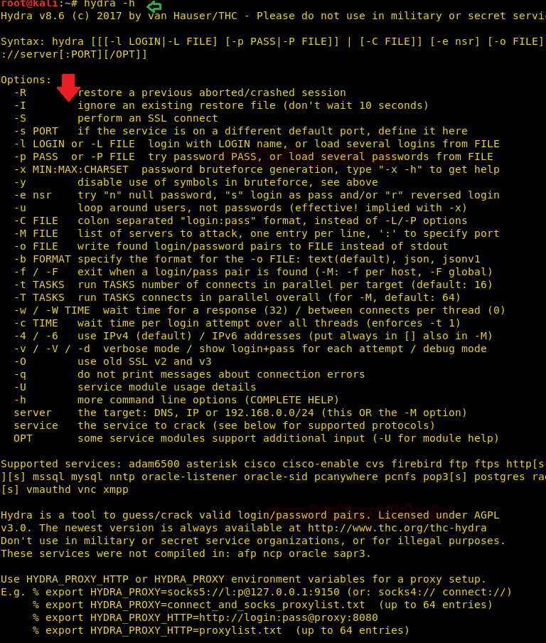 Cú pháp: hydra [[[-l ĐĂNG NHẬP | -L FILE] [-p PASS | -P FILE]] | [-C FILE]] [-e nsr] [-o FILE] [-t TASKS] [-M FILE [-T TASKS]] [-w TIME] [-W TIME] [-f] [-s PORT] [-x MIN: MAX: CHARSET] [-SuvV46] [service: // server [: PORT] [/ OPT]]