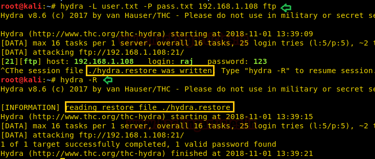 hydra -L user.txt -P pass.txt 192.168.1.108 ftp hydra -R