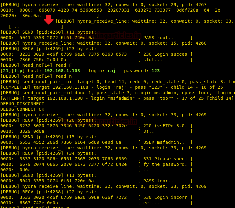 Do lo ngại về an ninh; quản trị viên mạng có thể thay đổi số cổng của một dịch vụ trên một cổng khác. Hydra thực hiện cuộc tấn công brute force vào cổng dịch vụ mặc định như bạn có thể thấy ở trên tất cả các cuộc tấn công, nó đã tự động thực hiện cuộc tấn công vào cổng 21 để đăng nhập FTP.