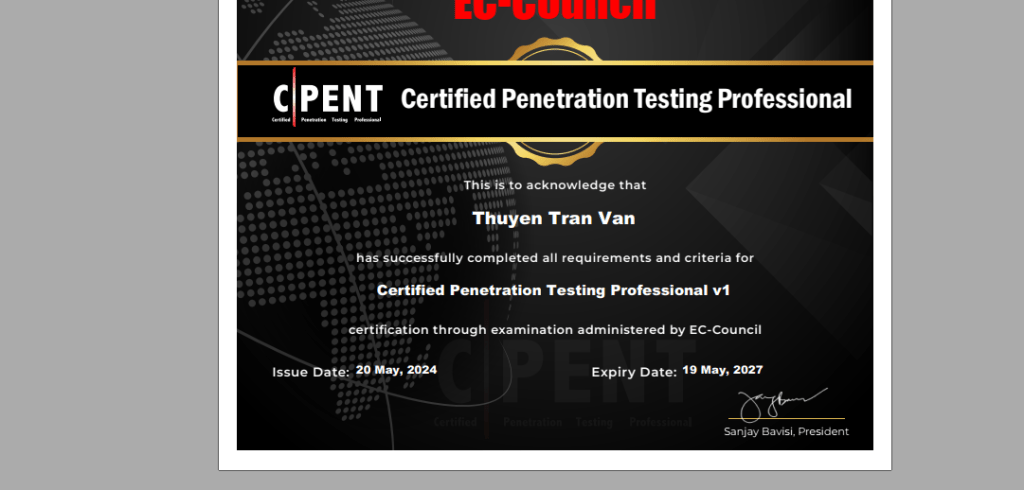 CPENT của EC-Council là một khóa học chuyên về thực hành tương tự như OSCP của Offensive Security. Được công bố vào đầu năm 2021, đây là một chứng chỉ được đánh giá có độ khó cao như OSCP về một số phương diện (tham khảo). Chương trình học dành cho các Chuyên gia Kiểm Thử Bảo Mật, yêu cầu cần có trình độ tương đương CEH v12 của ECC hay PENTEST + của Comptia , eJPT của eLearnSecurity hoặc hơn.