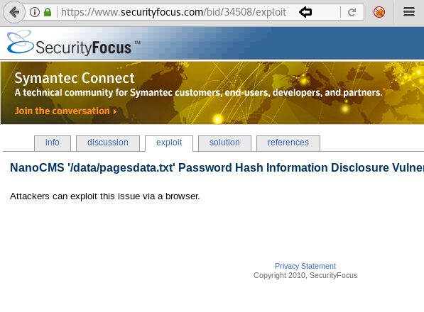 We got a clue from Andy Carp’s blog that the site is powered by NanoCMS. NanoCMS is a lightweight CMS based on PHP that is now discontinued. Therefore we searched on the possible vulnerabilities associated with Nano CMS on the internet and was able to get the details from the following URL https://www.securityfocus.com/bid/34508/exploit