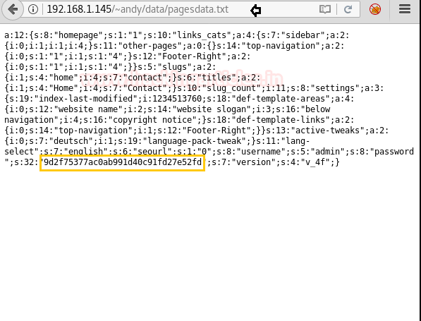 Let’s try to append the /data/pagesdata.txt with http://192.168.1.145/~andy/ and navigate to the URL http://192.168.1.145/~andy/data/pagesdata.txt.The following content will be seen which contains a lot of information. Upon further investigation we found that the Admin password hash is retrieved.