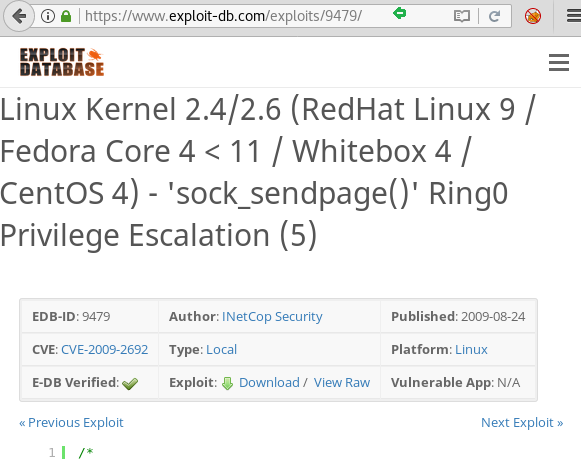 As we know that version of the kernel is vulnerable, we will download its exploit to the Kali machine from the Exploit DB website, as shown below: