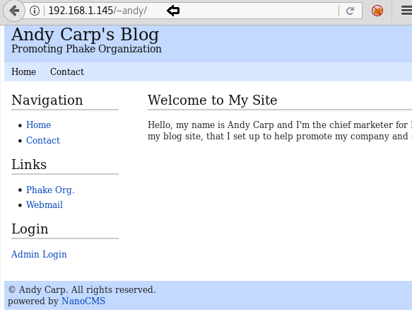 Click on the Blog tab of the website http://192.168.1.145 and it will redirect us to the URL http://192.168.1.145/~andy/