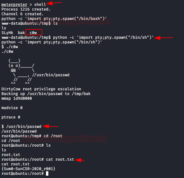 The shell that was generated has elevated privileges. To read the Root Flag, we will first convert this shell into a proper shell. Then we used the files created by the Dirty Cow exploit we log in as root. We can see that we have the root flag.
