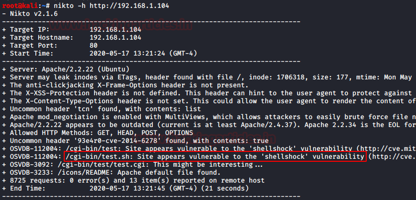 The Nikto scans the web application to find the /cgi-bin/ directory. on further inspection, the application was found vulnerable to shellshock vulnerability. Time to exploit it.