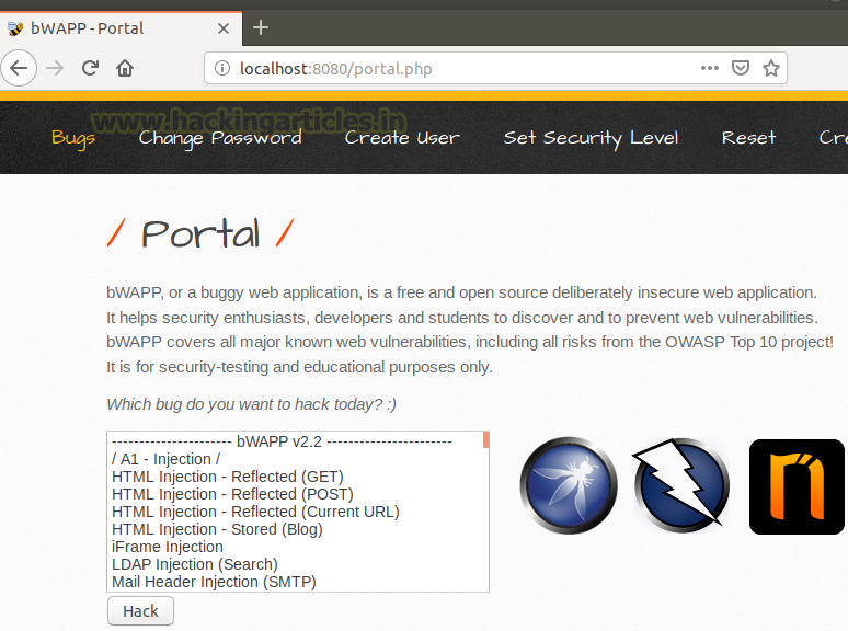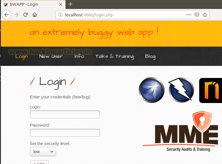 Bây giờ bạn sẽ nhận được trang đăng nhập của bWAPP, nơi chúng tôi sẽ sử dụng tên người dùng mặc định là ong và mật khẩu mặc định là lỗi và bạn đã đăng nhập vào bWAPP.