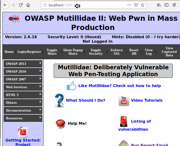 Lần này chúng ta đã chọn cổng 1137 để khởi chạy ứng dụng mutillidae. Do đó, ta sẽ mở trình duyệt cục bộ này bằng URL sau: localhost: 1337, nơi các bạn sẽ tìm thấy tùy chọn đặt lại cơ sở dữ liệu. Chỉ cần nhấp vào nó để thiết lập lại cơ sở dữ liệu.