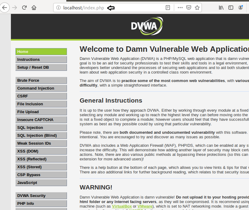 Ứng dụng web dễ bị tấn công (DVWA) là một ứng dụng web PHP / MySQL rất dễ bị tấn công. Mục tiêu chính của nó là hỗ trợ các chuyên gia bảo mật kiểm tra kỹ năng và công cụ của họ trong môi trường pháp lý, giúp các nhà phát triển web hiểu rõ hơn về các quy trình bảo mật các ứng dụng web và hỗ trợ cả sinh viên và giáo viên tìm hiểu về bảo mật ứng dụng web trong một lớp học được kiểm soát Môi trường.