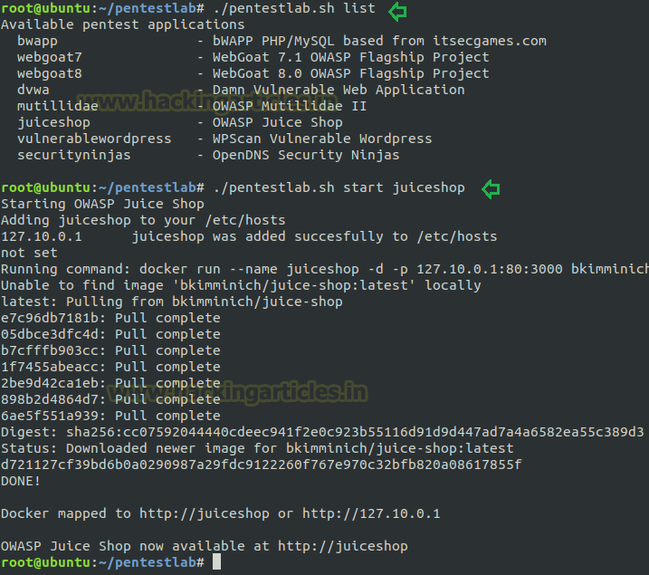 Chúng tôi có thể sử dụng PentestLab Management Script vì script này sử dụng docker và bí danh máy chủ để cung cấp các ứng dụng web trên localhost ”và nó có thể kéo các ứng dụng sau.