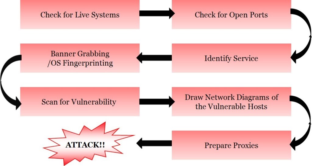 Kẻ tấn công làm theo một trình tự các bước cụ thể để quét bất kỳ mạng nào. Mặc dù một cách tiếp cận chung đã được trình bày, các phương pháp quét có thể khác nhau dựa trên các mục tiêu tấn công, được thiết lập trước khi những kẻ tấn công thực sự bắt đầu quá trình này.