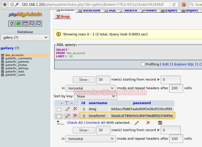Điều hướng đến cơ sở dữ liệu gallery , nhấp vào dev_accounts. Sau đó bấm vào tab SQL và nhập truy vấn SQL bên dưới. Bây giờ chúng tôi có tên người dùng và mật khẩu băm!