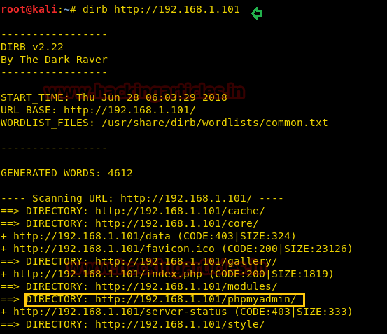 Với điều này, chúng tôi sẽ nhận được thông tin từ nhiều thư mục như trong đầu ra bên dưới. Tuy nhiên, thư mục phpmyadmin có vẻ khá thú vị, vì nó có thể có một số thông tin quan trọng cần hiển thị