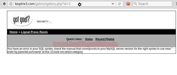 Sau khi điều hướng qua trang web, tôi nhận thấy rằng bằng cách nhấp vào tùy chọn sắp xếp và id ảnh, URL có tham số “id” có thể biểu thị lỗ hổng SQL injection. Sau khi đặt dấu ‘ sau php?id=1 , tức là (bằng cách thử với http://kioptrix3.com/gallery/gallery.php?id=1 ‘ ), dấu nhắc lỗi SQL sẽ xuất hiện như hình bên dưới. Điều này có nghĩa là URL web có thể bị tấn công SQL injection. Bây giờ các bạn có thể dùng sqlmap hay havji … để pentest