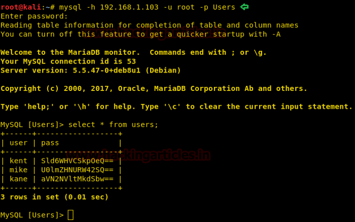 Bây giờ sử dụng lệnh MySQL để xem tên người dùng và mật khẩu. Và lệnh SQL là: