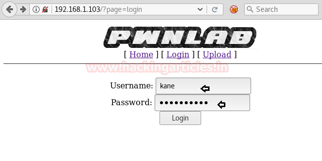 Vì vậy, khi mở IP mục tiêu trên trình duyệt và khám phá tab Login thì thấy đưa ra biểu mẫu đăng nhập như hình bên dưới. Vì ta không biết về thông tin xác thực đăng nhập của nó nên thử các kỹ thuật SQL injection nhưng hiện tại không có gì hữu ích và tùy chọn cuối cùng là sử dụng CURL. Nếu bạn quan sát thấy URL http://192.168.1.103/?page=login thì bạn có thể tin rằng nó trông giống như bị LFI .