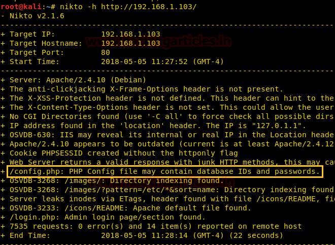 Bây giờ, ta sẽ sử dụng lệnh Nikto để tìm ra tệp đang lưu trữ chúng. Nikto giúp ta biết tất cả các tên tệp và dữ liệu chứa trong đó.