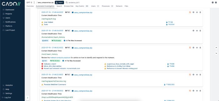 Chuyển đến tab Điều tra tự động, Cado hiển thị các sự kiện quan trọng nhất liên quan đến vụ việc. Những sự kiện quan trọng này giúp các nhà phân tích bắt đầu và tiến hành cuộc điều tra của họ một cách liền mạch.