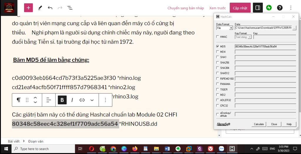 Các giá trị băm này có thể dùng Hashcal chuẩn lab Module 02 CHFI