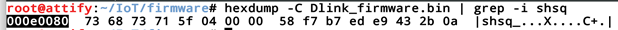 Hãy áp dụng một số kiến thức này vào thực tế. Chúng tôi biết rằng một số nhà cung cấp hệ thống tệp Squashfs nén LZMA sử dụng số ma thuật shsq. Vì vậy, chúng ta có thể thực hiện hexdump trên chương trình cơ sở của mình và grep để shsq biết địa chỉ bắt đầu của chương trình cơ sở.